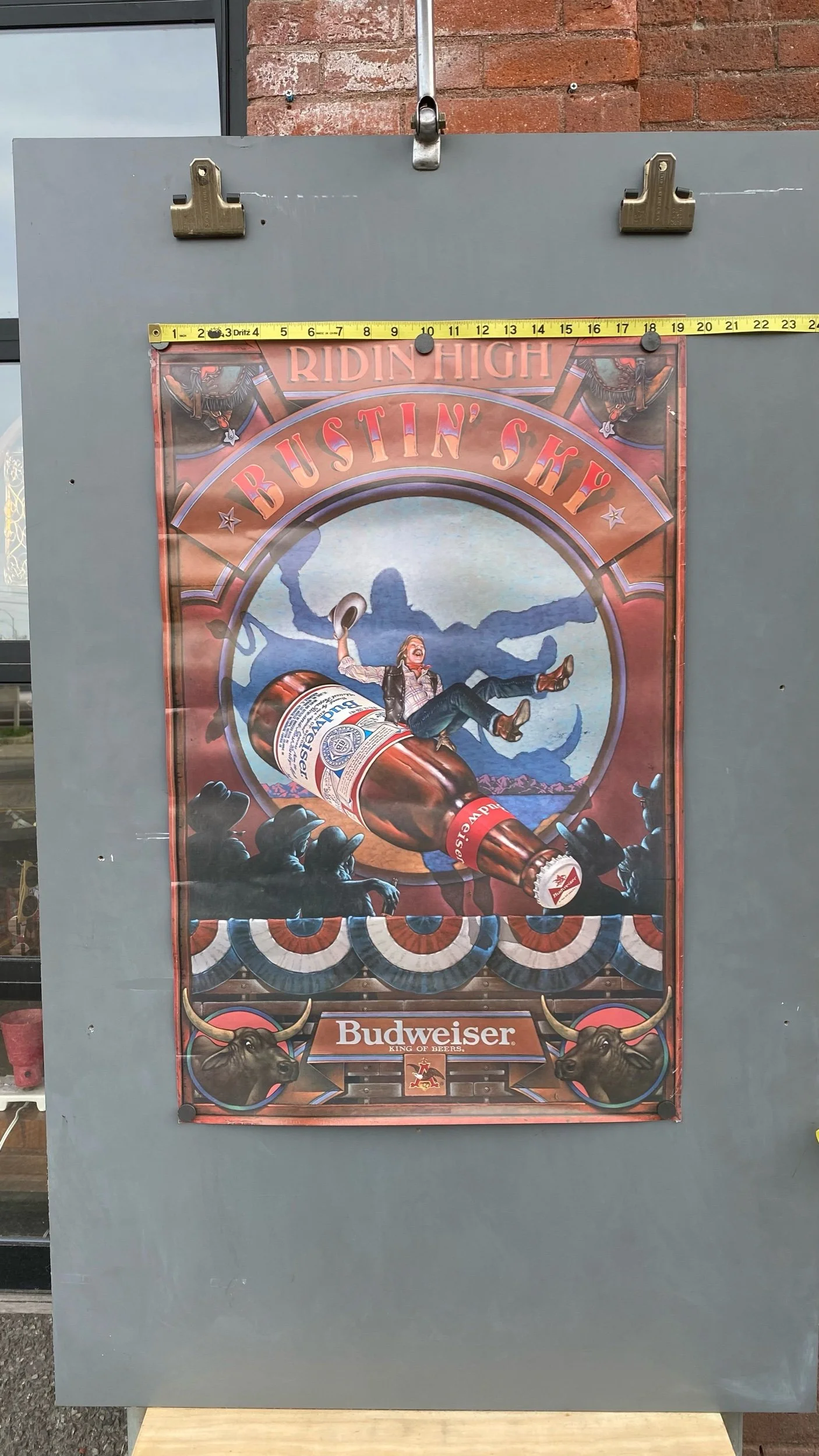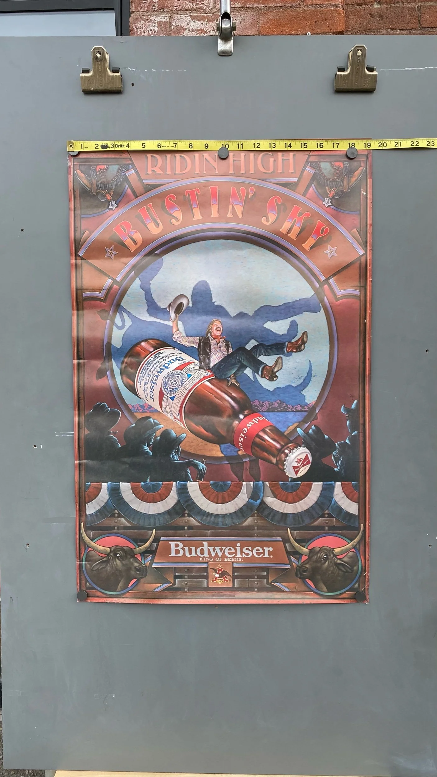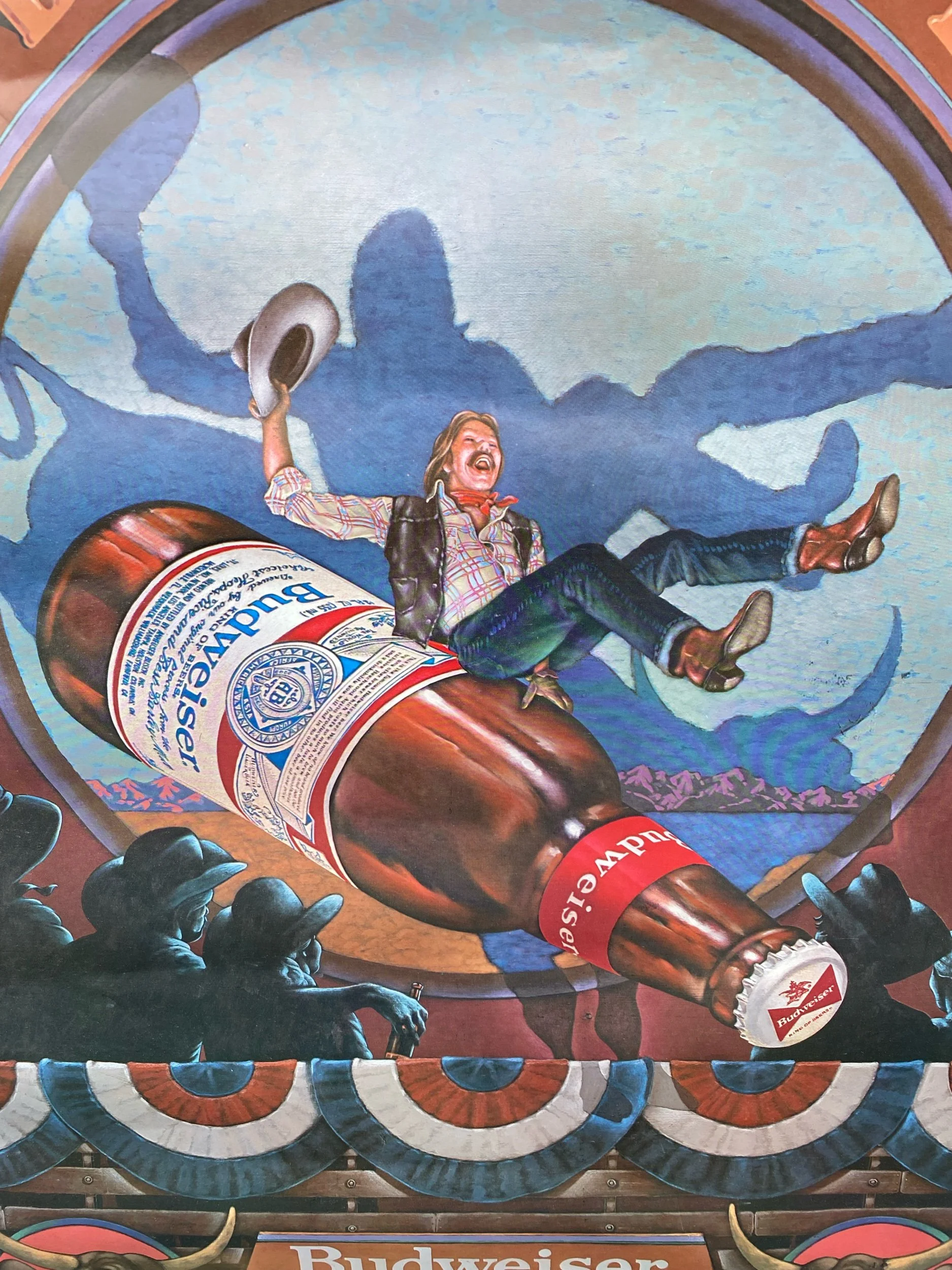Vintage Budweiser Beer Poster Ridin High Busting Sky Cowboy Rodeo 80s Advertising