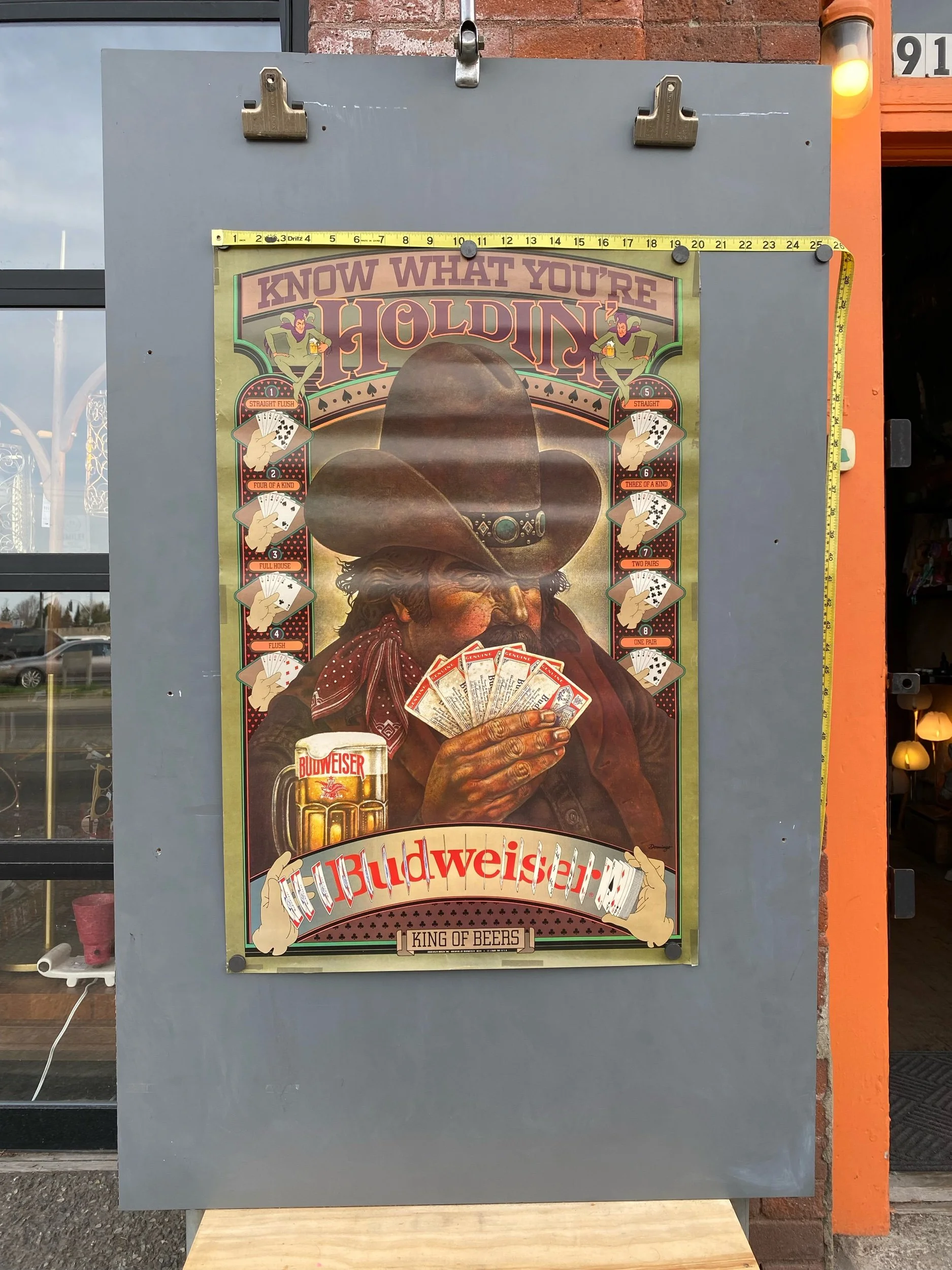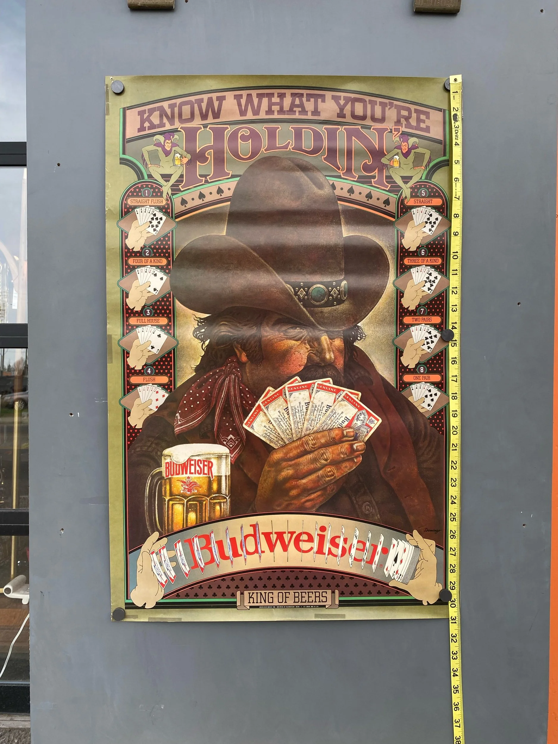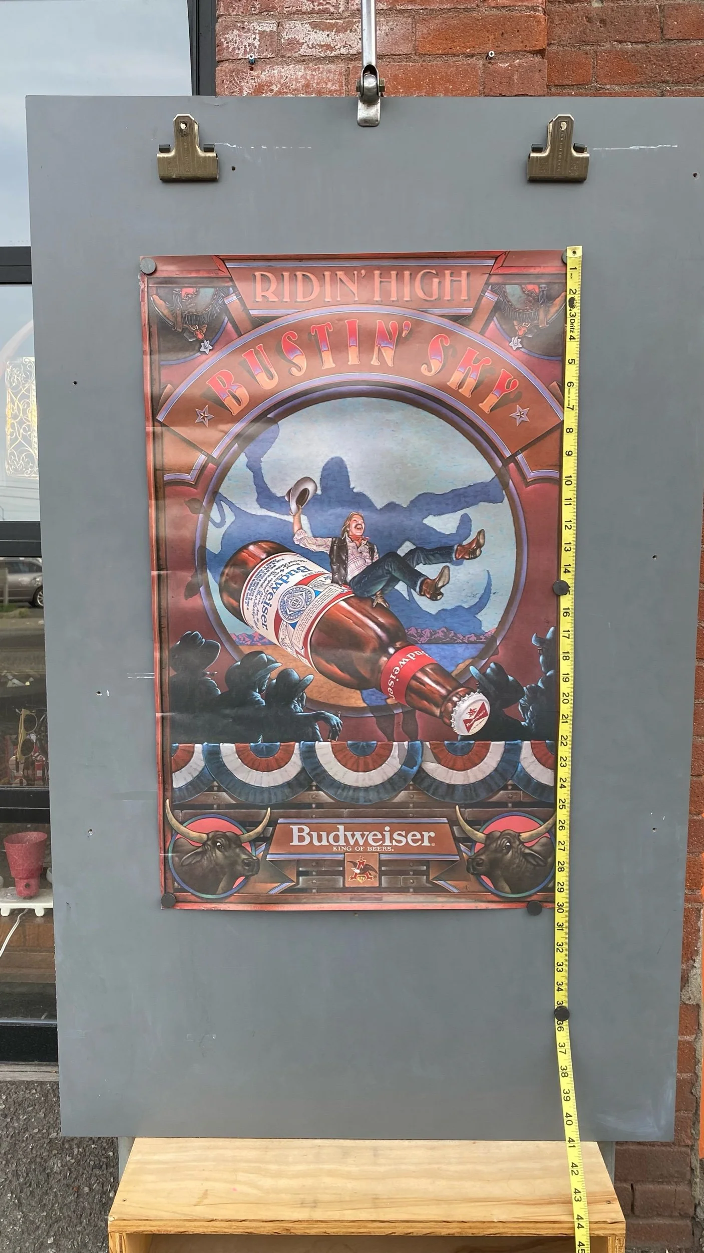 Vintage Budweiser Beer Poster Ridin High Busting Sky Cowboy Rodeo 80s Advertising