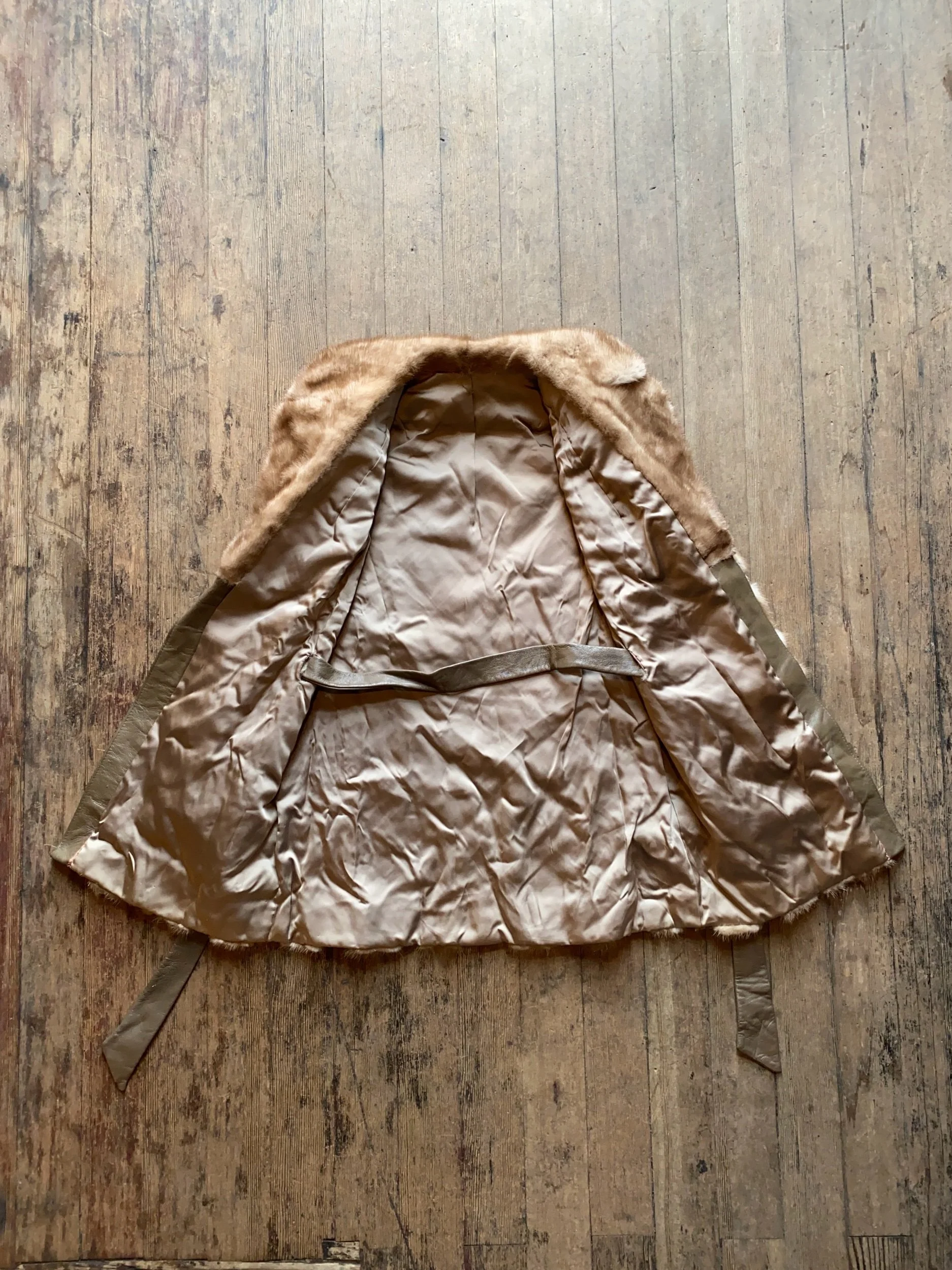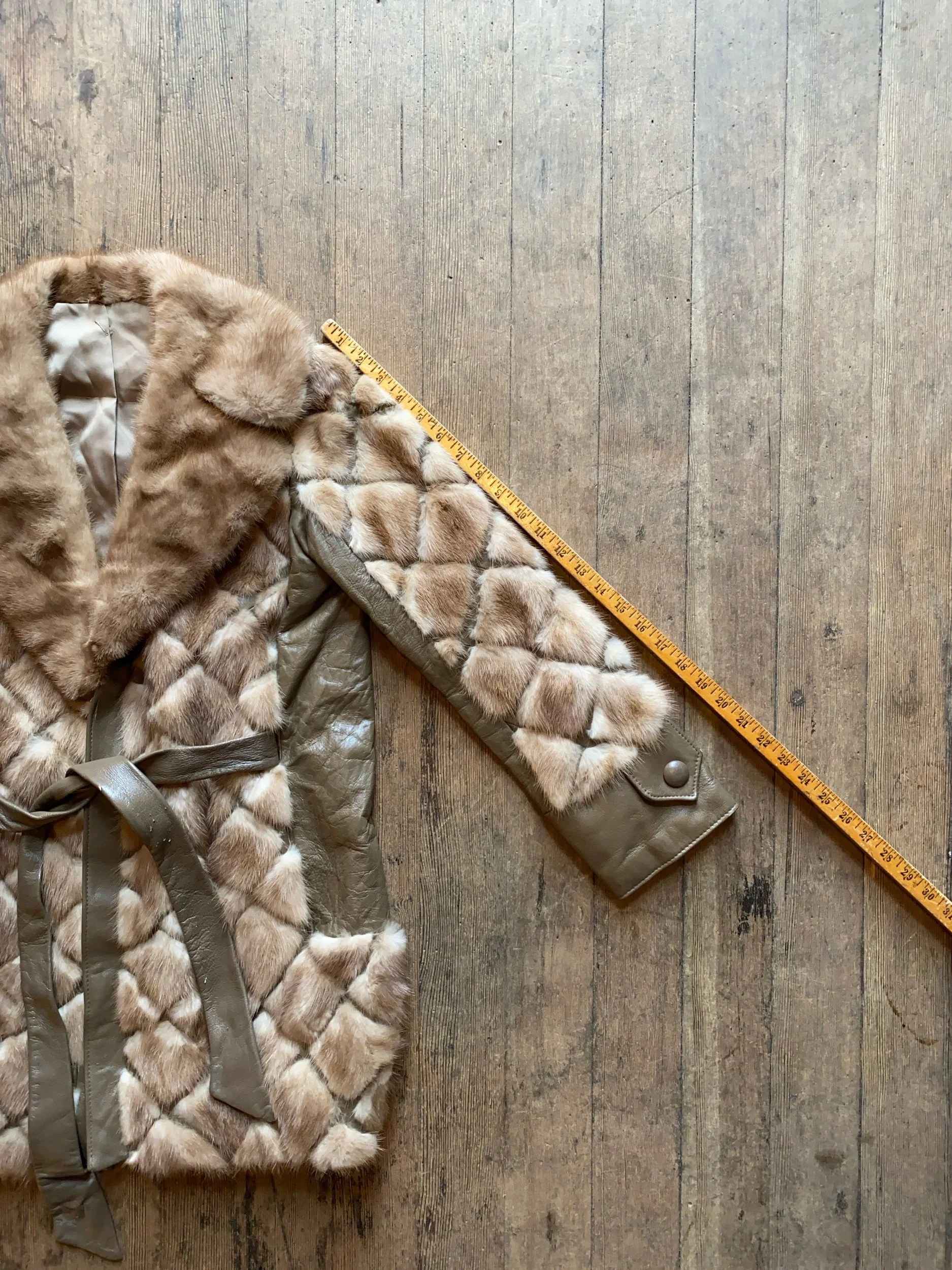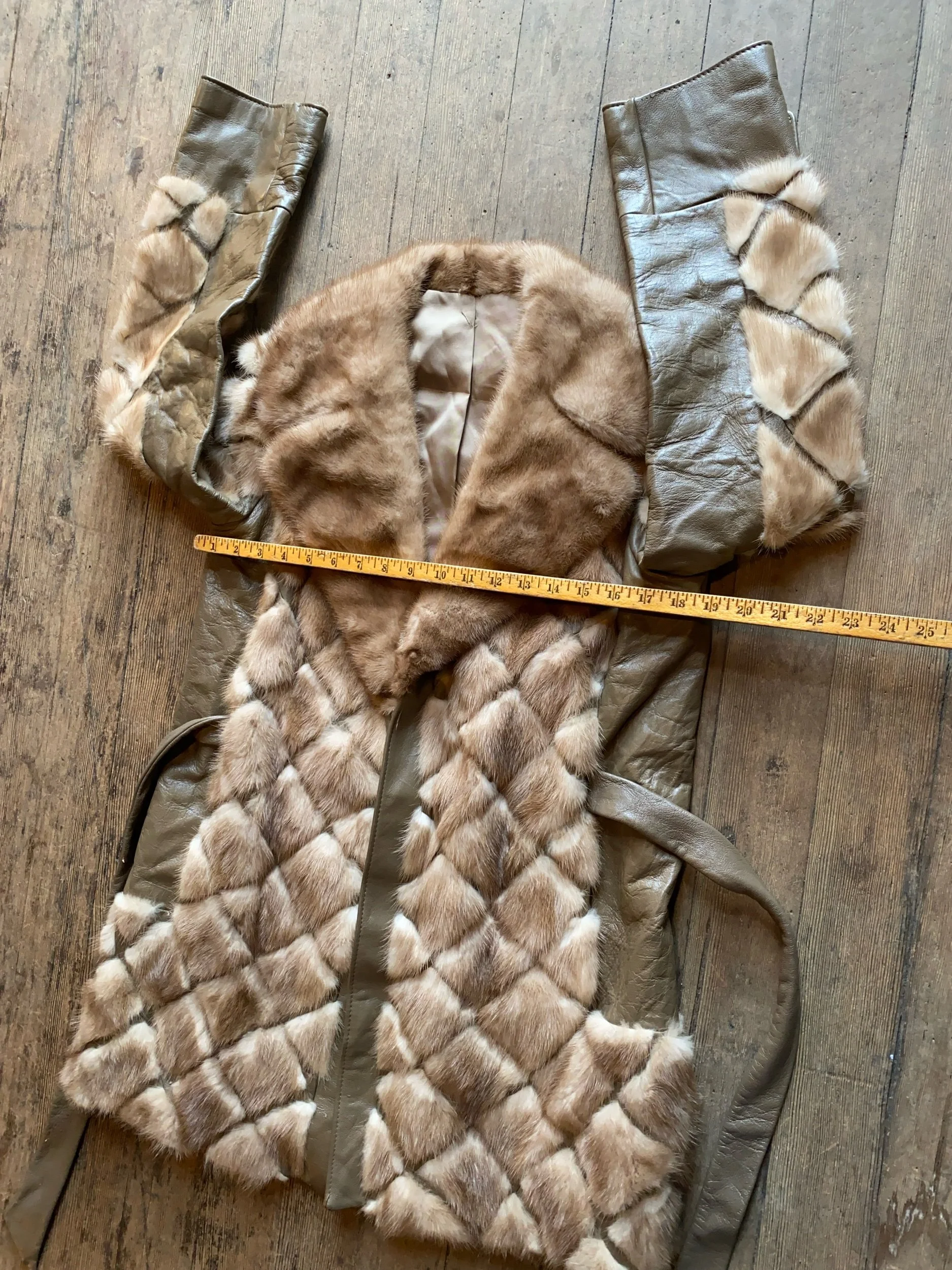 Vintage 60s scored fur leather belted fur coat shawl collar