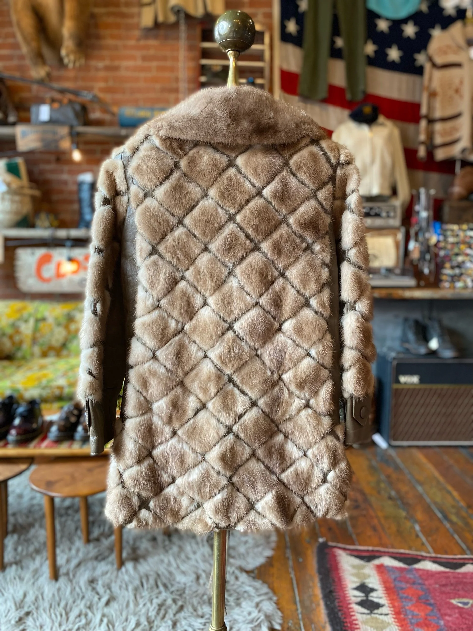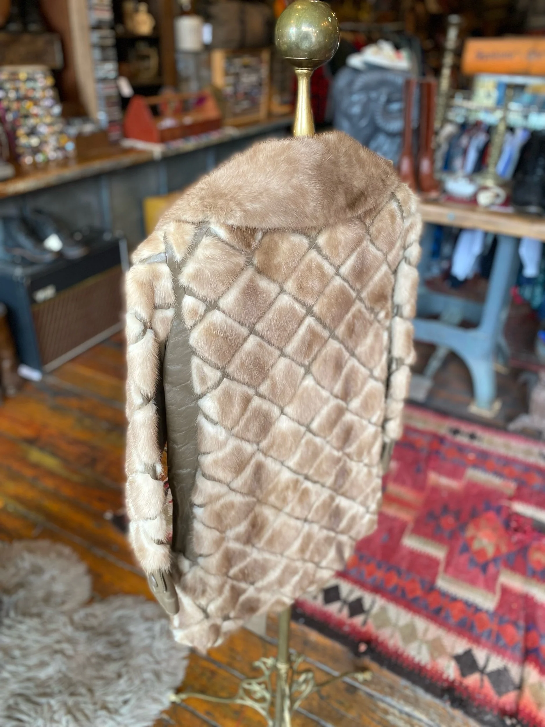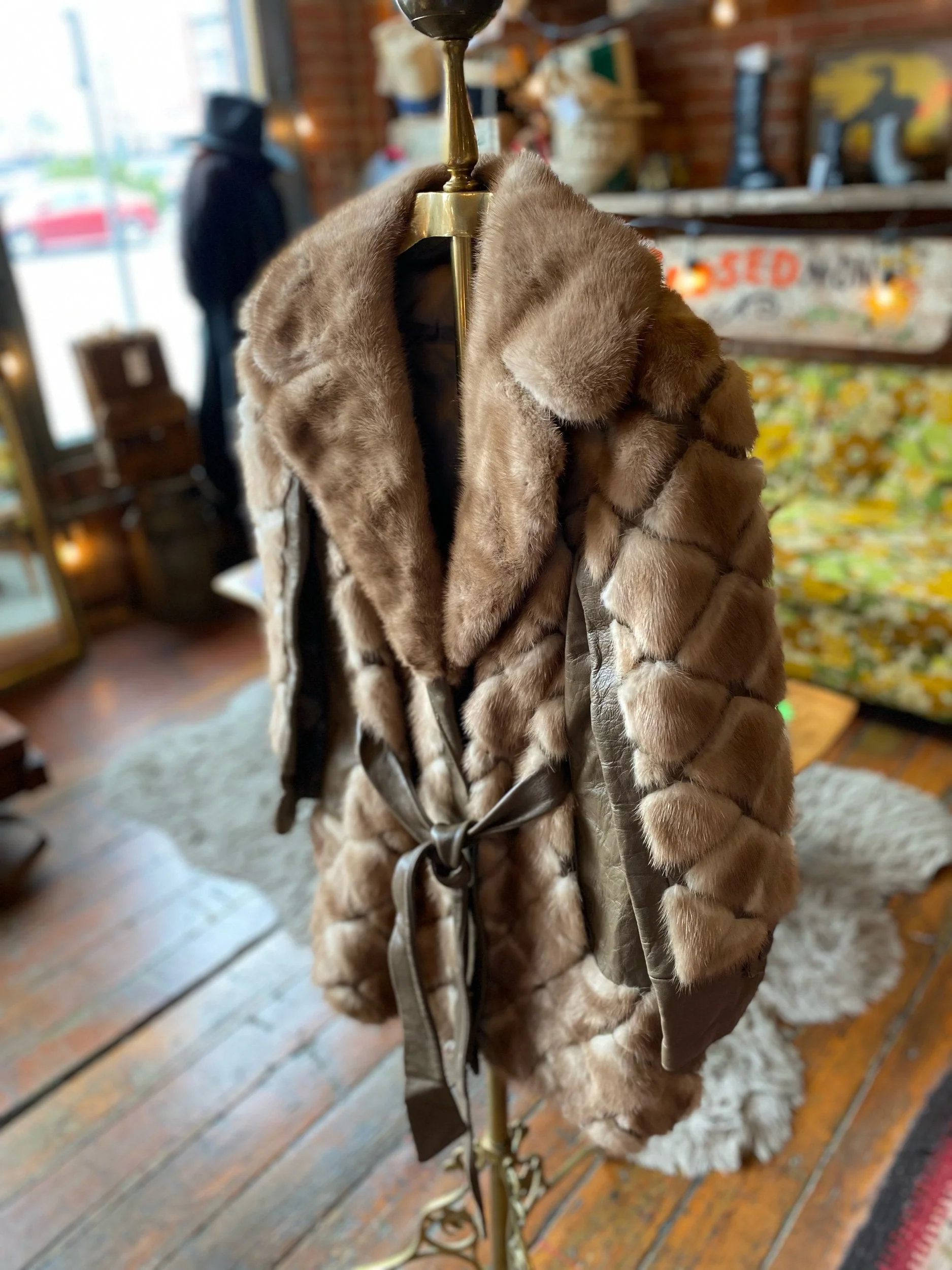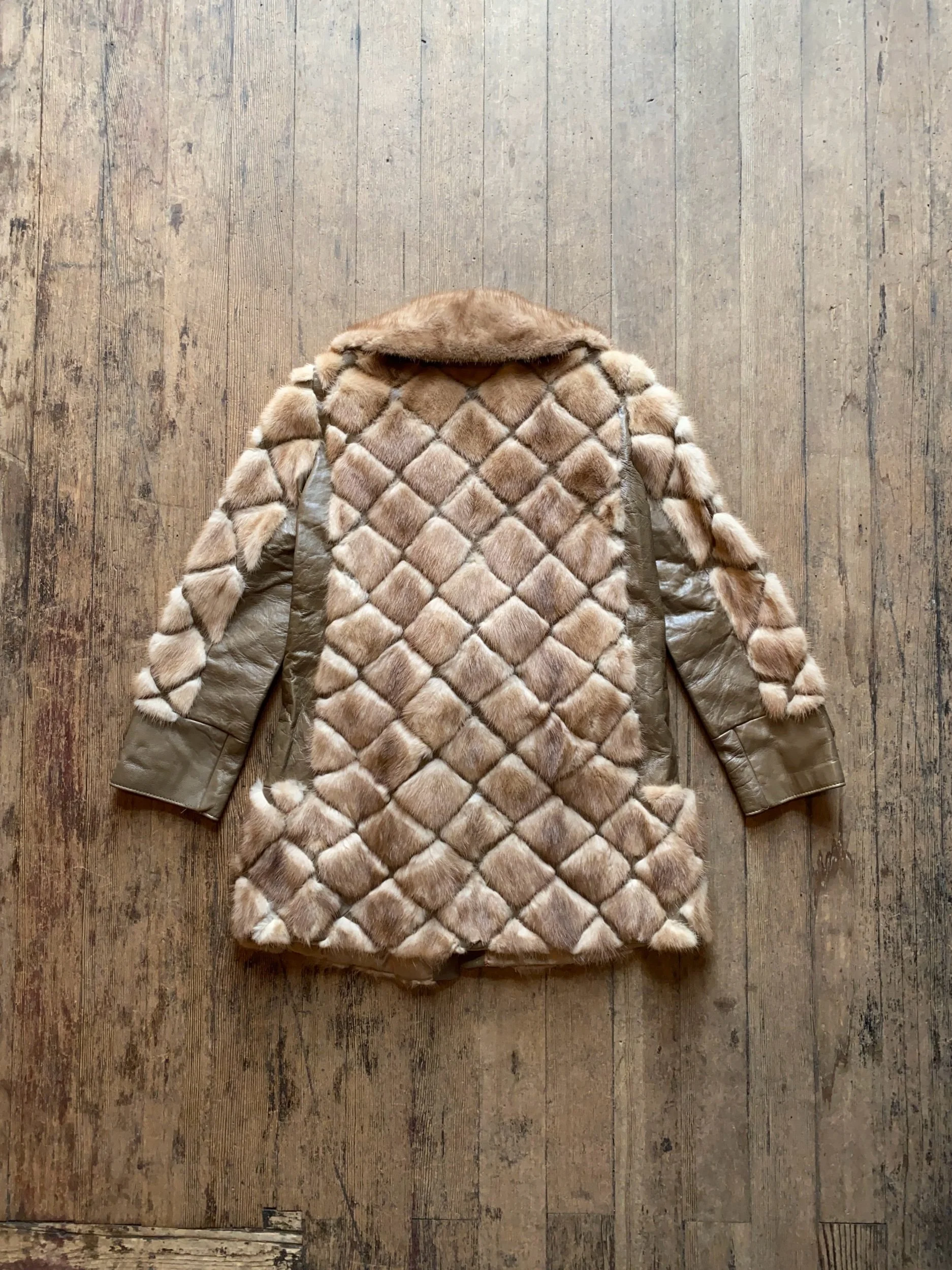 Vintage 60s scored fur leather belted fur coat shawl collar